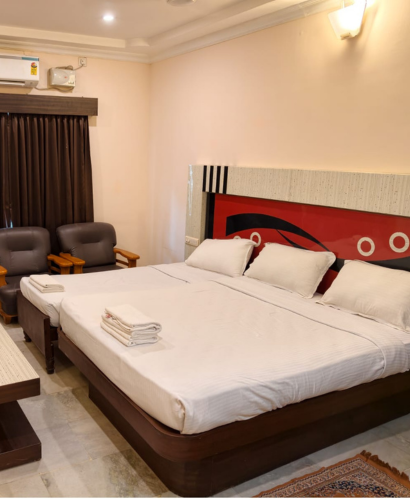 Our Double Deluxe A/C Room in Velankanni offers spacious interiors, elegant furnishings, and modern amenities for a relaxing stay. Designed for comfort and convenience, the room includes air conditioning, comfortable bedding, and clean, well-maintained interiors.